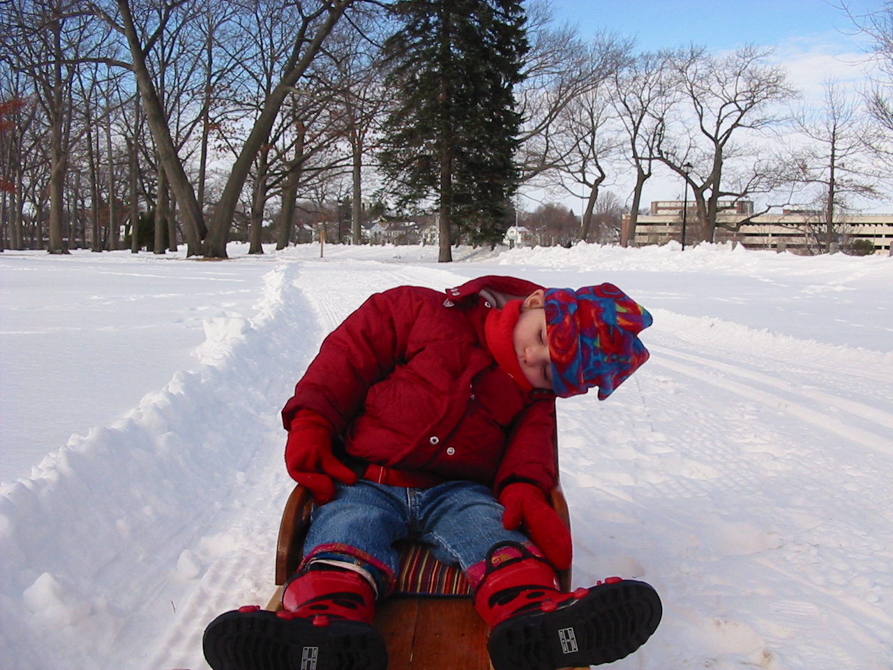 Eva falls asleep while sledding.