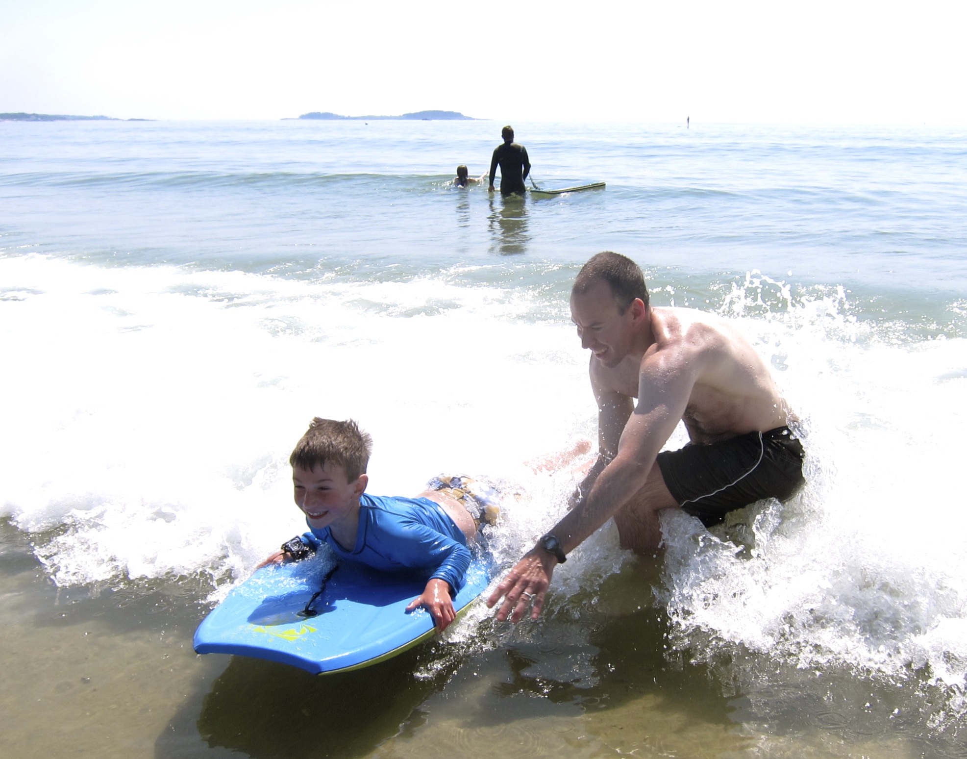 At Scarborough Beach. The Ollaris arrived as well; here Uncle Chris shows Noah how to boogie board.