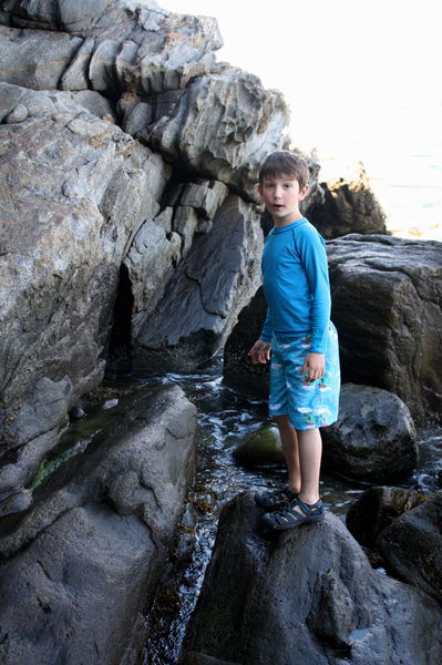 Climbing on the rocks and exploring the tide pools at Cliff House Beach.